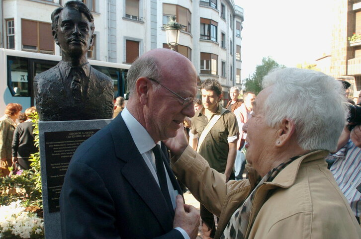 Gernikako bonbardaketaren 69. urteurrenean, George L.Steer-en omenez inauguratutako bustoa. Irudian, bere semea hunkituta.