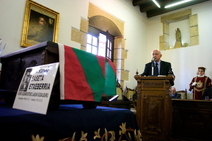 Jokin Gorostidi militante historikoaren hil kapera Debako udaletxe aurrean. Irudian, Jokinen burkide eta bikote Itziar Aizpurua.