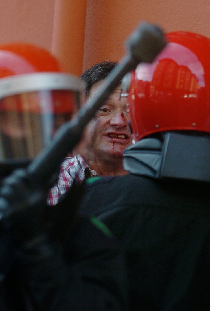 Ertzaintzaren oldarraldia Durangon Herri Batasunaren 30.urteurrenaren harira antolatutako ekitaldien aurka.