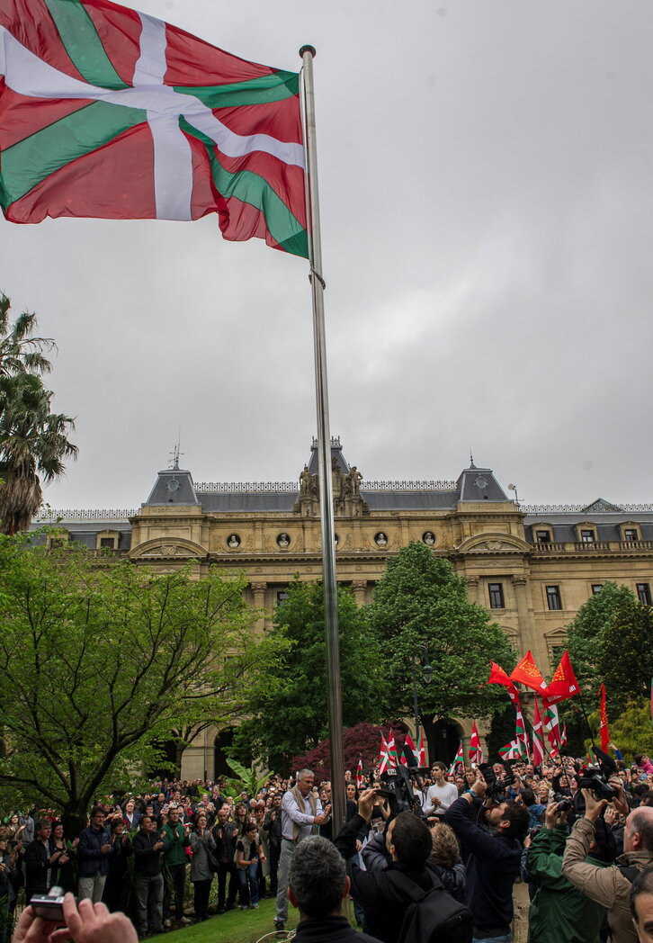 Gipuzkoako Aldundiak Gipuzkoa plazan jarritako ikurrina handiaren aurkezpena, Espainiako bandera ezartzeko aginduaren aurka.