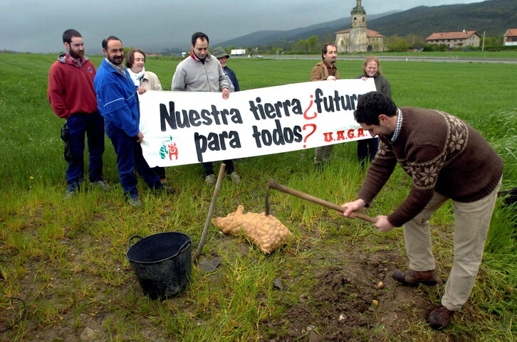 Eibar-Gasteiz arteko errepide berriaren aurkako patata ereite sinbolikoa Betolazan UAGA sindikatuaren eskutik.