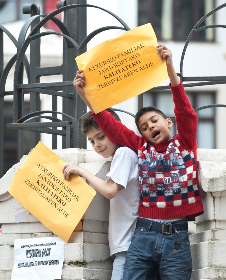 Atxuriko García Rivero eskolako guraso eta haurren kontzentrazioa, greban dauden eskola jantokietako langileen alde.