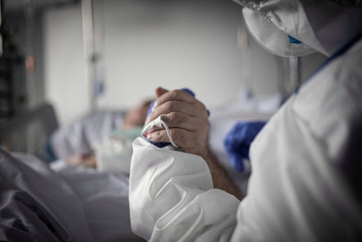 Fisioterapeuta bat covid-dun gaixo bat artatzen Gurutzetako ospitaleko suspertze-atalean.