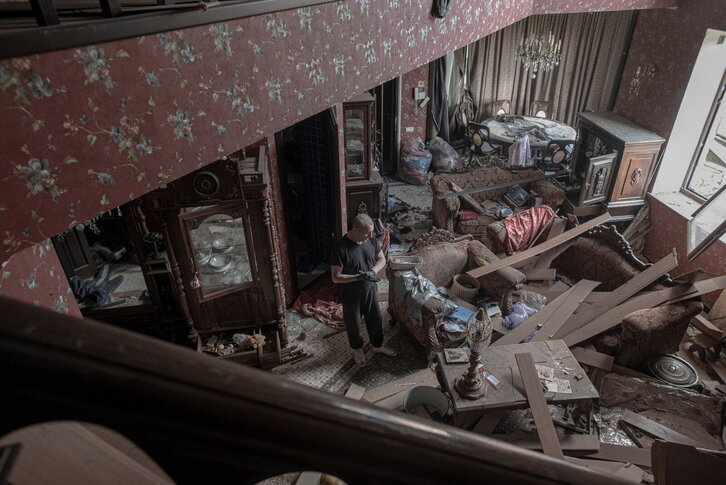 Gizon bat bere etxe suntsituaren barruan Ukrainako Kharkiv herrian.
