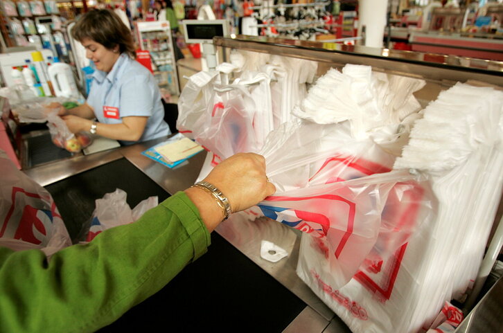 Berriozarreko Eroski dendan, plastikozko poltsak bezeroentzat eskuragarri.