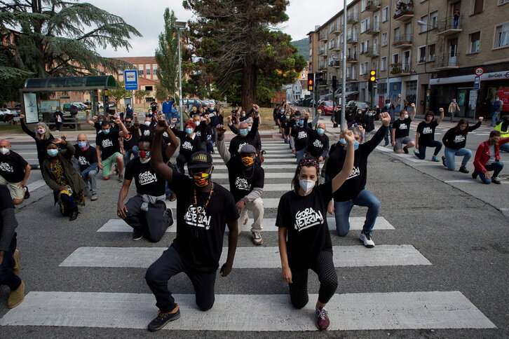 Sorturen performance Iruñean arrazakeria eta polizia bortizkeria salatzeko.