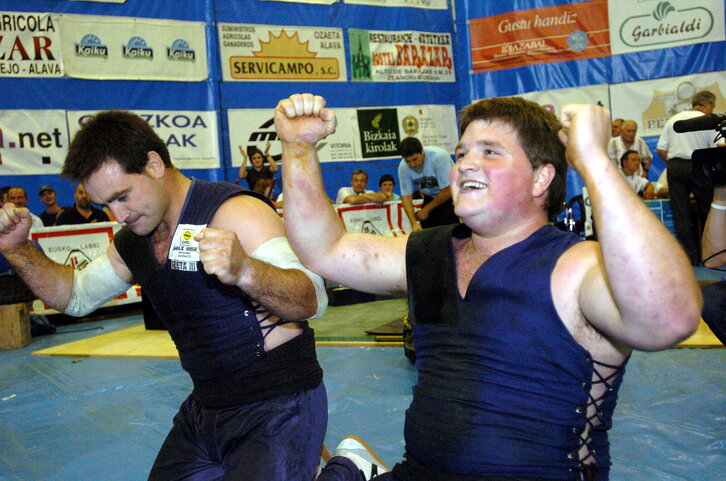 Izeta III eta Aimar Irigoien Urrezko Harrijasotzaileak-eko txapeldun, Zelailuze eta Saralegi menderatu ondoren.