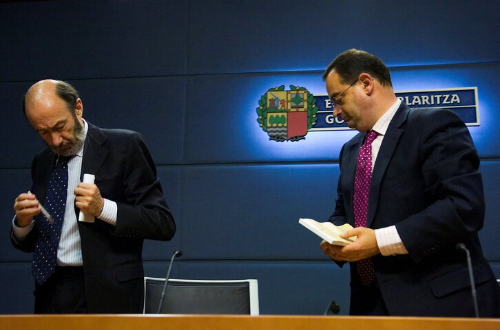 Javier Balza eta Alfredo Perez Rubalcabaren prentsaurrekoa Lakuan ETAren su-etenaren amaiera dela eta.