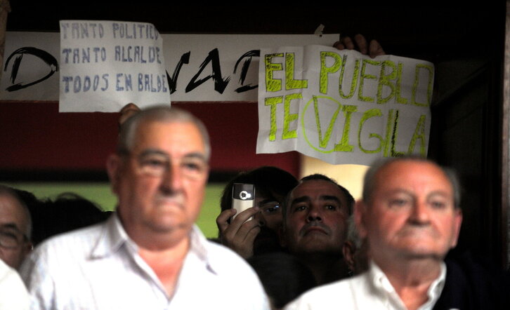 Gazteak Bilbon, Foru Aldundiko balkoian, gaztetxeen aurkako erasoak eta Sorgintxulo gaztetxearen itxiera saiakera salatzeko.