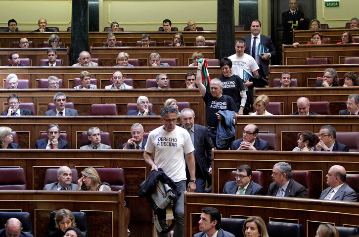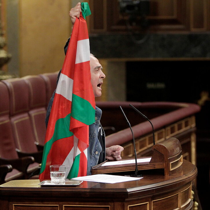 Sabino Cuadra Madrilgo Kongresuan, ikurrina batekin Abdikazio Legearen bozka egunean.