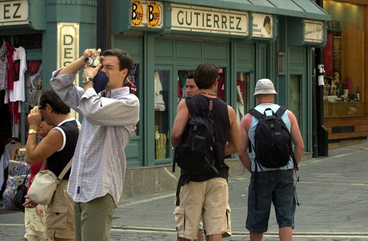 Turisten iritsiera Iruñera, Sanferminen atarian.