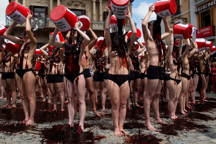 Anima Naturalis eta Peta elkarteek Iruñeko udal plazan antolatutako protesta zezenketen aurka.