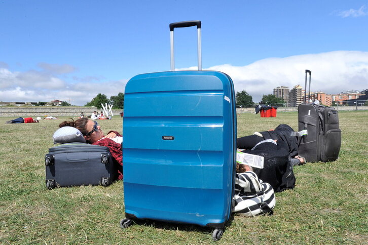 Sanferminak Iruñean. Irudian, jendea autobus estazio ondoko belardian atseden hartzen.