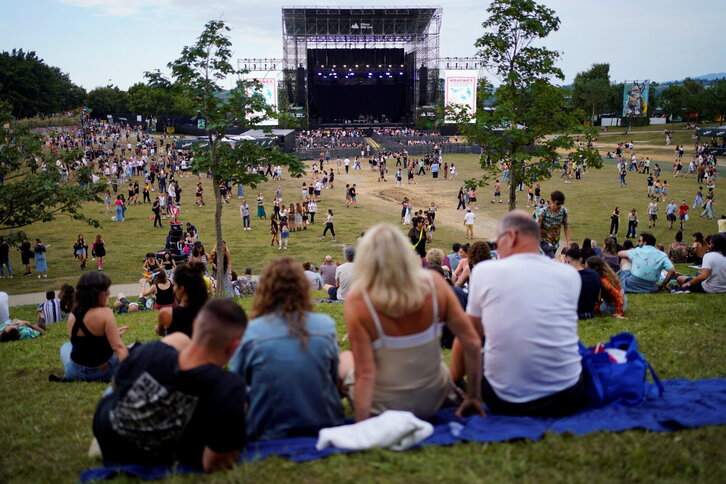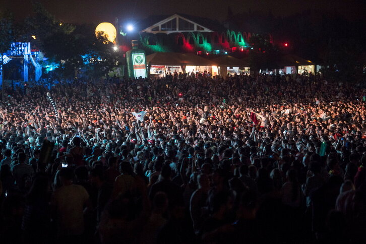 Sanferminak Iruñean. Gora Iruñea ekimenaren gunea. Argazkian, Obrint Pas taldearen kontzertua.