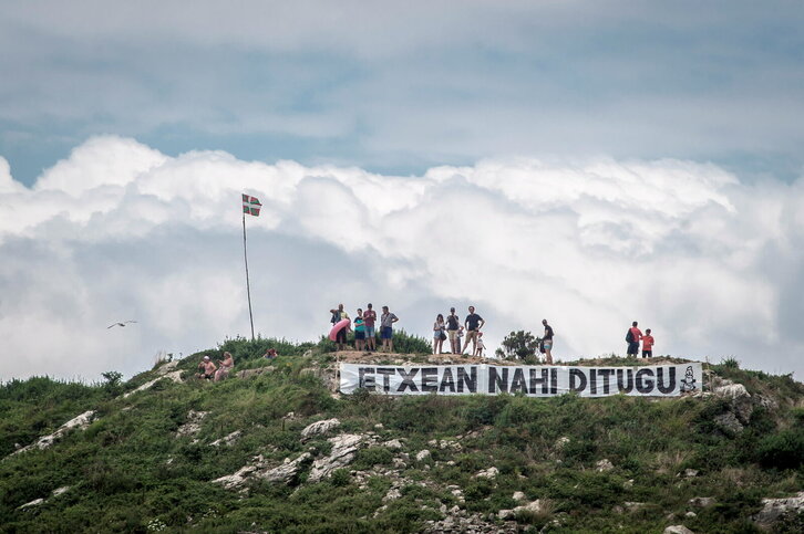 Euskadiko Arraun Txapelketa Lekeition. «Etxean nahi ditugu» leloarekin pankarta bat Lekeitioko San Nikolas uhartean.