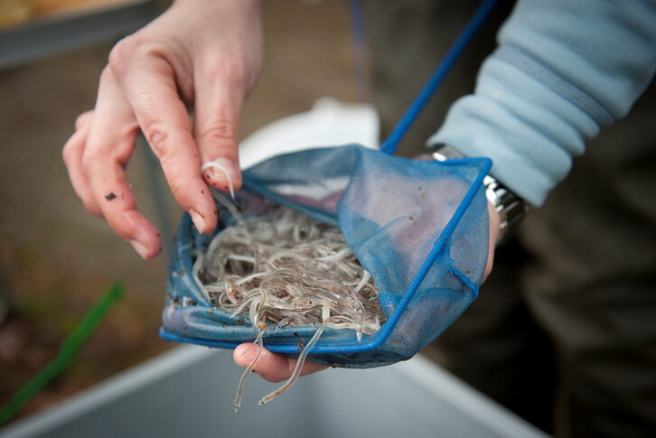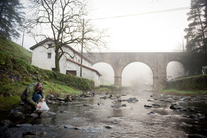 Azti-Tecnaliako langile bat Urola ibaian angulak askatzen hauek birpopulatzeko helburuz.