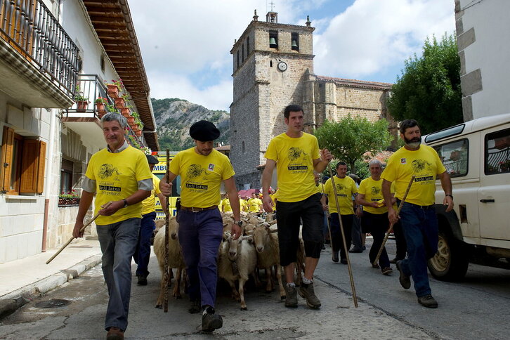 Artzaiak «Ardi latxa arriskuan!» lelopeko kamisetekin Uharte Arakileko Artzain Egunean.