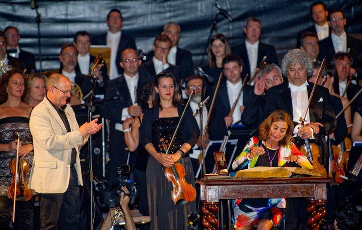 Cristina Ugarte sailburuak jaso du Donostiako udalak Euskadiko Orkestra Sinfonikoari emandako domina, Juan Karlos Izagirre alkatearen eskutik.
