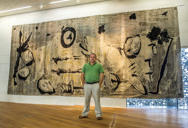 Koldobika Jauregi 1813ko Donostiako suntsiketan eta 1937ko Gernikako bonbardaketan oinarritzen den 'Gernika' alfonbraren aurrean.