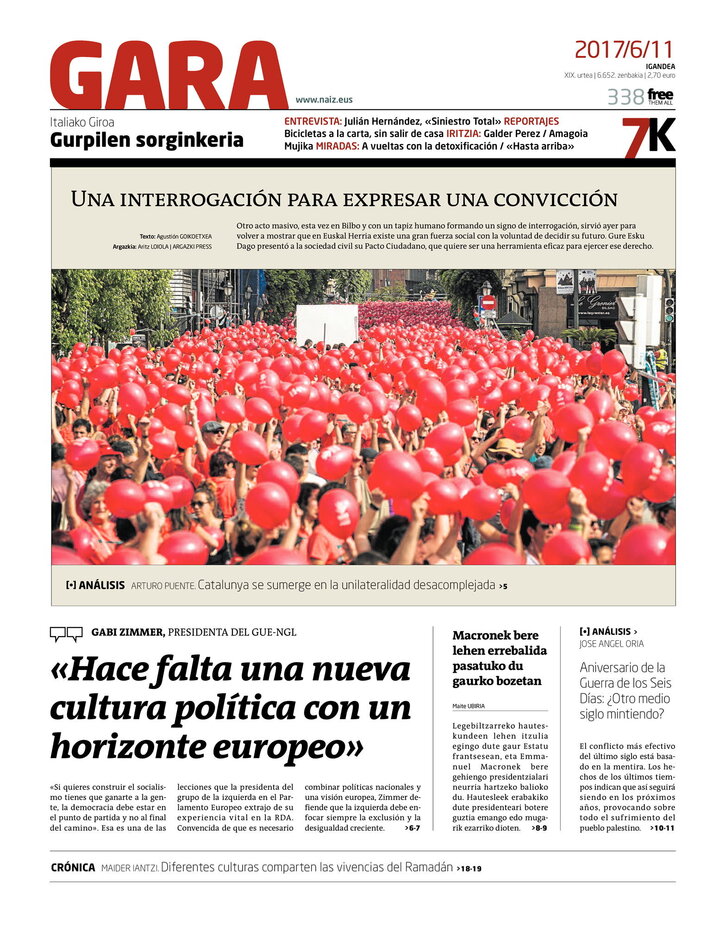 Gure Esku Dago consigue formar en Bilbo un signo de interrogación con 10.000 personas