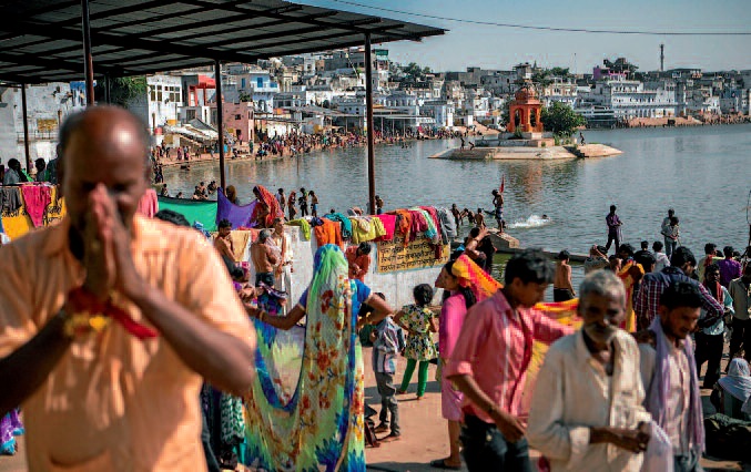 Hemen, Varanasin bezala, aszetismoa egiten duten brahman eta sadhuak daude; horiek espiritualtasun bila doan erromesari harrera egiten diote beren otoitz eta mundu transzendentalaren ezagutzarekin. Horrexegatik da, hain zuzen, hiri hau bidaiarien eta hippyen topagune. 40 urteko Vishnu, adibidez, Pushkarretik gertu dagoen mendi bateko ashram txiki batean bizi den gizon santua da. Handik hiri osoa ikus daiteke, Savitri mendiak zedarrituta alde batetik –Brahmaren ezkontide den jainkosa bat gurtzen duen tenplu bat dagoena– eta beste aldean Gayatri Devik mugatua. Sadhu beterano hau, beste aszeta batzuen gurua dena, Pushkarren ertzean bolada luze bat eman zuen katalan baten maisu ere izan zen. Kataluniara itzuli zenean, Vishnu Bartzelonara gonbidatu zuen yogi gisa bere jakintza transmititu ahal izateko.