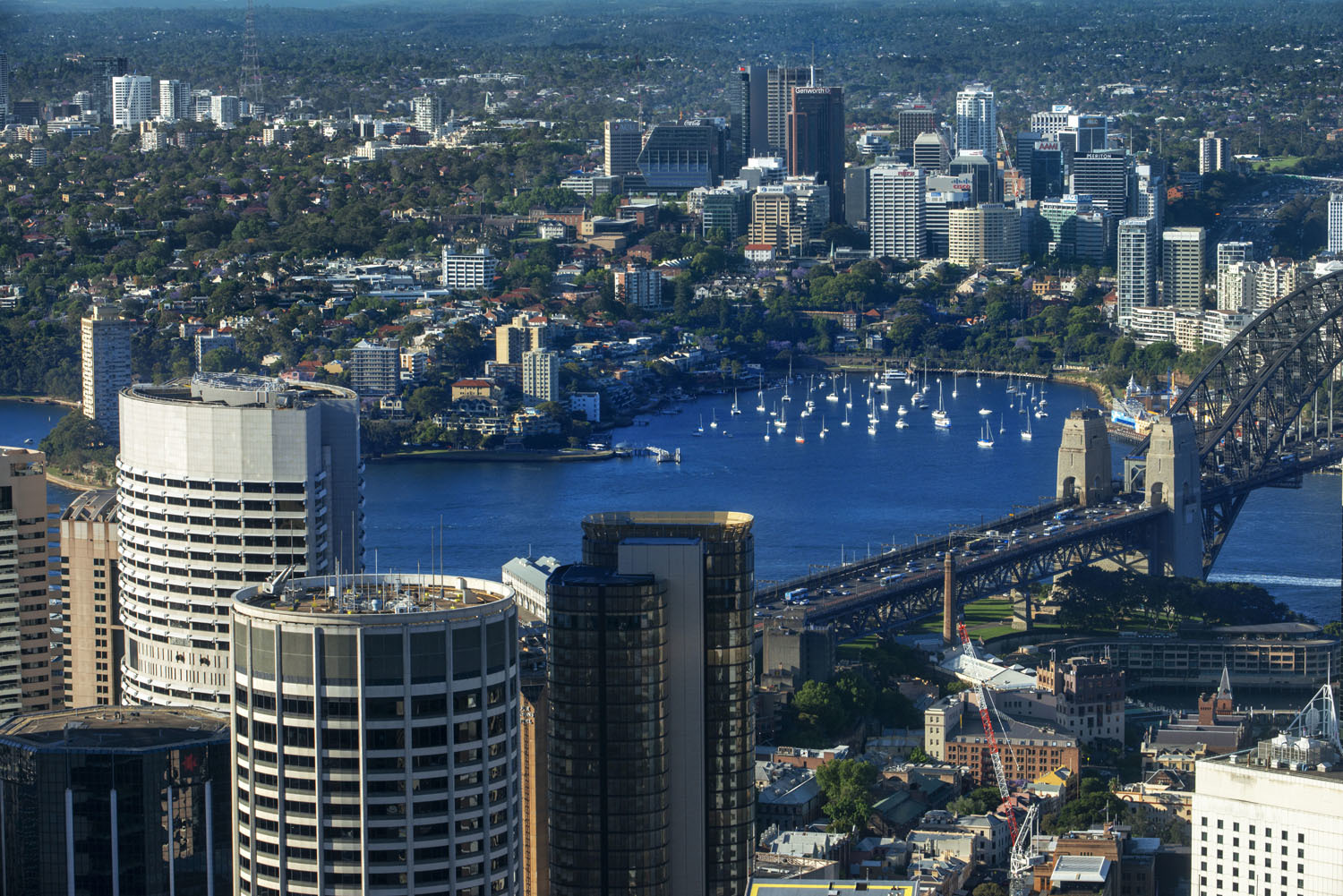 The Rocks-etik, Sydney Harbour Bridge famatuak zeharkatzen du badia Sydneyko iparralderaino. 150.000 ibilgailuk zeharkatzen dute egunero zubi hori, erdialdera iristeko edo handik irteteko. 1932an inauguratu zen, eta oinezkoentzako errei bat, bizikletentzako beste bat, treneko bi bide eta autoentzako zortzi errei ditu. Bridge Climb atrakzio turistikoari esker, arkuaren punturik altuenera irits daiteke, 135 metroko altuerara. Zubia 1.400 langilek eraiki zuten, eta horietatik 16k bizitza galdu zuten eraiki bitartean. Pintatzea ez da lan erraza, 30.000 kilo pintura behar baitira geruza bakarra emateko 60 futbol-zelairen pareko espazio honi.