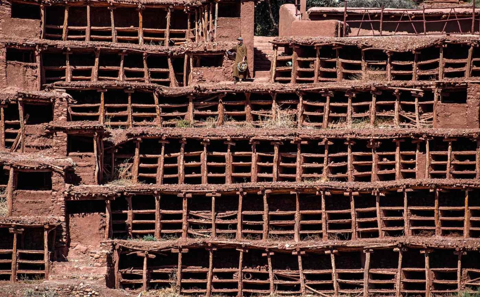 El complejo es espectacular, sorprendente: una estructura de cinco pisos de puntales de madera y barro seco se extiende a lo largo de una ladera; cada compartimento alberga una colmena cilíndrica de mimbre, cubierta con una mezcla de tierra y estiércol de vaca. Los expertos dicen que es la colmena colectiva tradicional más antigua del mundo, que data de 1850, pero, lamentablemente, hoy está amenazada en medio de un clima cambiante.