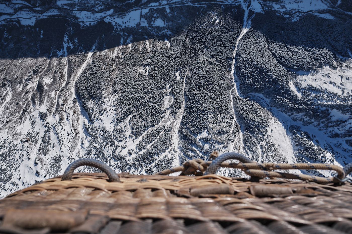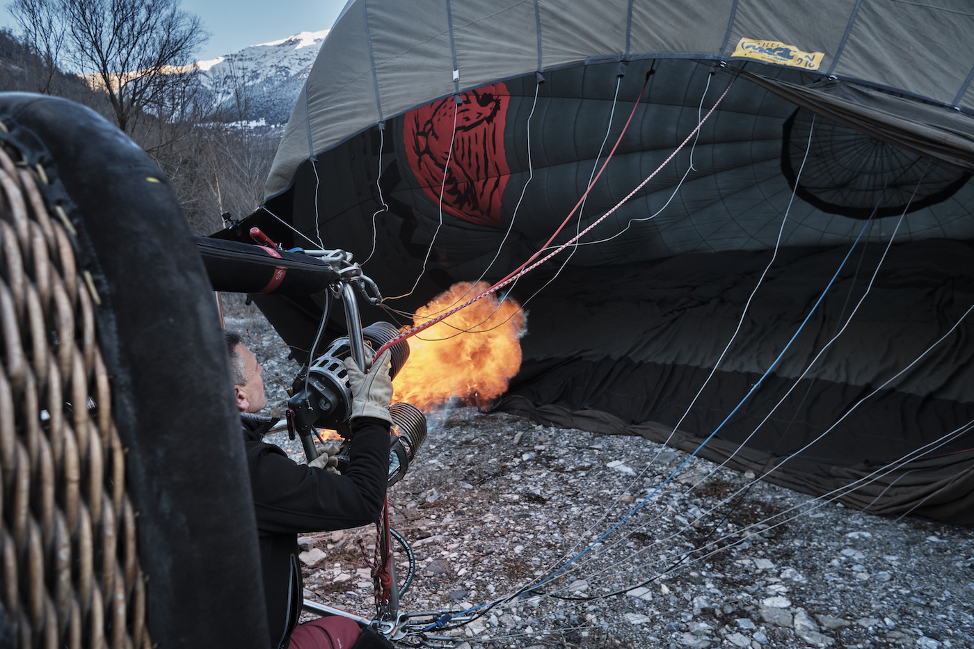 [7:45] -5ºC-an gaude eta eskuak izoztu egiten dira eskularruak kentzen baditugu. Hasi da Pep eta Miquelentzat ia errituala dena. Saskia etzanda dagoela, ainguraleku eta kable guztiak lotu behar dira; hegaldia hasitakoan hura belatik zintzilikatuko dutenak, alegia. Haizagailu baten eta erregailuek isurtzen duten suaren beroaren laguntzaz, bolumena hartu du Gausacetik hurbil dagoen eremu batean luzatutako oihal handiak. Maitek eta Aurelik oihalaren ahoari eutsi diote airea sar dadin, eta Pep eta Miquelek kableak eta zintak ondo jarri dituzte barrualdean. Marina, Lluis, Joan eta Mariak tripulazioa osatzen dute, eta haien esanei jarraitu diete. Lluisek, bien bitartean, argazkiak egin dizkio, iragarritako eguzkiaren lehen printzekin, zuritik laranjara egin duen Montcorbison (2.173 metro) mendiaren atzean egunari agur esan dion ilargiari.