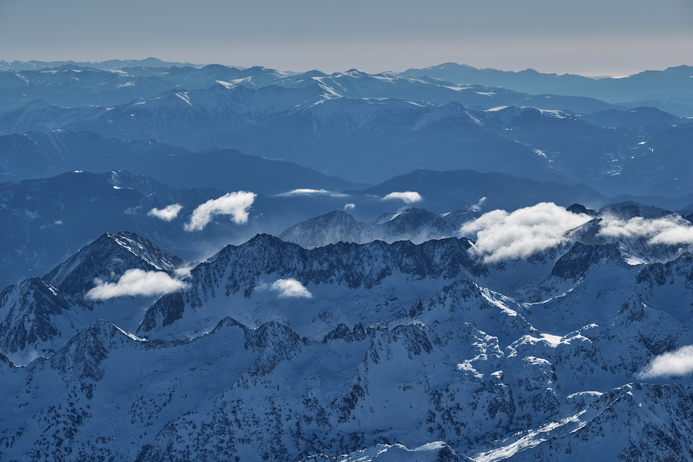 Baina itzul gaitezen Pirinioetara, 4.696 metroko altitudean, gure hegaldian lortuko dugun maximoan, 40 bat kilometro egin ondoren. Hemendik, mapa honen gainean, eskala naturalean, honako hauek kokatu ditugu: Aneto (3.403), Monte Perdido (3.355), Turbón (2.492), mendebaldean; ekialdean, Pla de Beret eta Port de la Bonaigua -Val d'Aran eta Pallars Sobirà lotzen dituena-, Pica d' Estats (3.143), Encantats-eko bi orratzak (2.743 eta 2.748) -parkearen ikur-, Montsent de Pallars (2.883), Pedraforca urruna (2.506); eta hegoaldera, Congost de Montrebei eta, txiki-txiki, Montserrat, Montseny, Serra de Prades… Eta herriak: Arties, Vilac edo Salardú edo Boí eta Taüll, Unescok Gizateriaren Ondare izendatutako erromanikoa gordetzen dutenak.