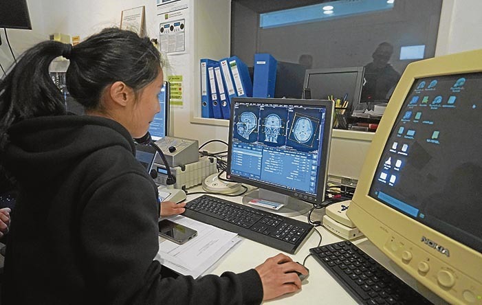 Laborategien azken instalazioetarako bidean, Carreirasek ñabardura egin digu. «Baditugu bestelako proiektuak ere, Gurutzetako neurozirujauekin adibidez, eta horietan bai, teknika inbaditzaileak erabiltzen ditugu, zeren pazienteari burua ireki eta estimulatzen zaio ebakuntza aurreko prozesua gurekin egitera etorri delako. Tumoreak hizkuntzaren zirkuituak dauden burmuinaren areatan dauzkan jendea bidaltzen digutenean, ebakuntza aurreko prozesua hemen egiten dute, dena diseinatzen dugu elkarrekin burmuineko kirurgia egiteko, eta horrek lagunduko digu zenbat ebakuntza egin behar den jakiten, gaixotasun kroniko bezala geratuko ote den, 15 urteko edo gehiagoko bizi esperantza tasa egoteko… Gure makinetan ikusten dugu tumorea non dagoen, noraino infiltratua den edo ez, eta Gurutzetakoekin sesio klinikoa antolatzen dugunean, tumorea ahalik eta gehien lehortzeko nondik eta noraino sartu erabakitzen da. Ebakuntzan bertan egoten gara gu, eta ebakuntzaren erdian esnatzen da pazientea eta neurozirujauak guk iradokitako parte hori estimulatzen du lehortu dezakeen edo ez jakiteko. Horrela badaki, adibidez, zati hori ezin duela lehortu bestela pazientea afasiko aterako litzatekeelako. Gu hor gaude, estimulatzen duen parte horrek jokaera zehatz bat sortzen duen ala ez ikusten, eta hiru aldiz estimulatu badu eta bitan hitza galdu badu, neurozirujauek badakite hortik ezin dutela sartu. Guk ematen diegu plus hori, doikuntza izan dezaten zati hori lehortzeko mintzamena galdu gabe. Bueno, luzatu naiz. Hor baduzu beste erreportaje baterako haria».