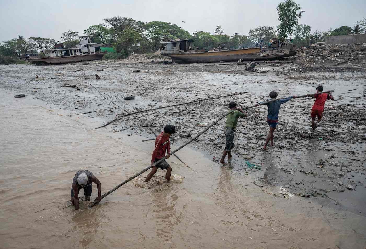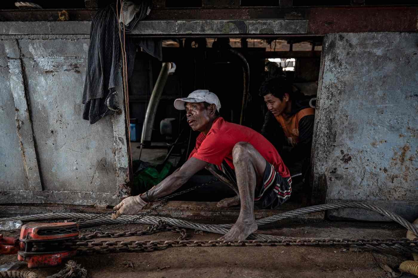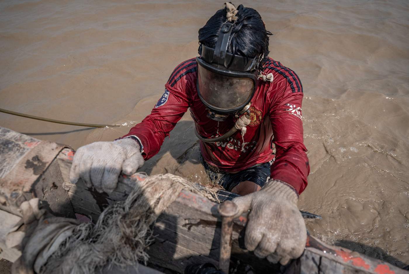 Gorputzaren inguruan metalezko kate bat duela, Nyunten lankide Thet Oo txanda hasteko prestatzen ari da. ‘Río Esmeralda’ ontziko lohia kendu behar du. Bere jarduna arriskutsua da, iluntasunean lan egin behar duelako, 25 metroko sakoneran eta korronte indartsuek astinduta.