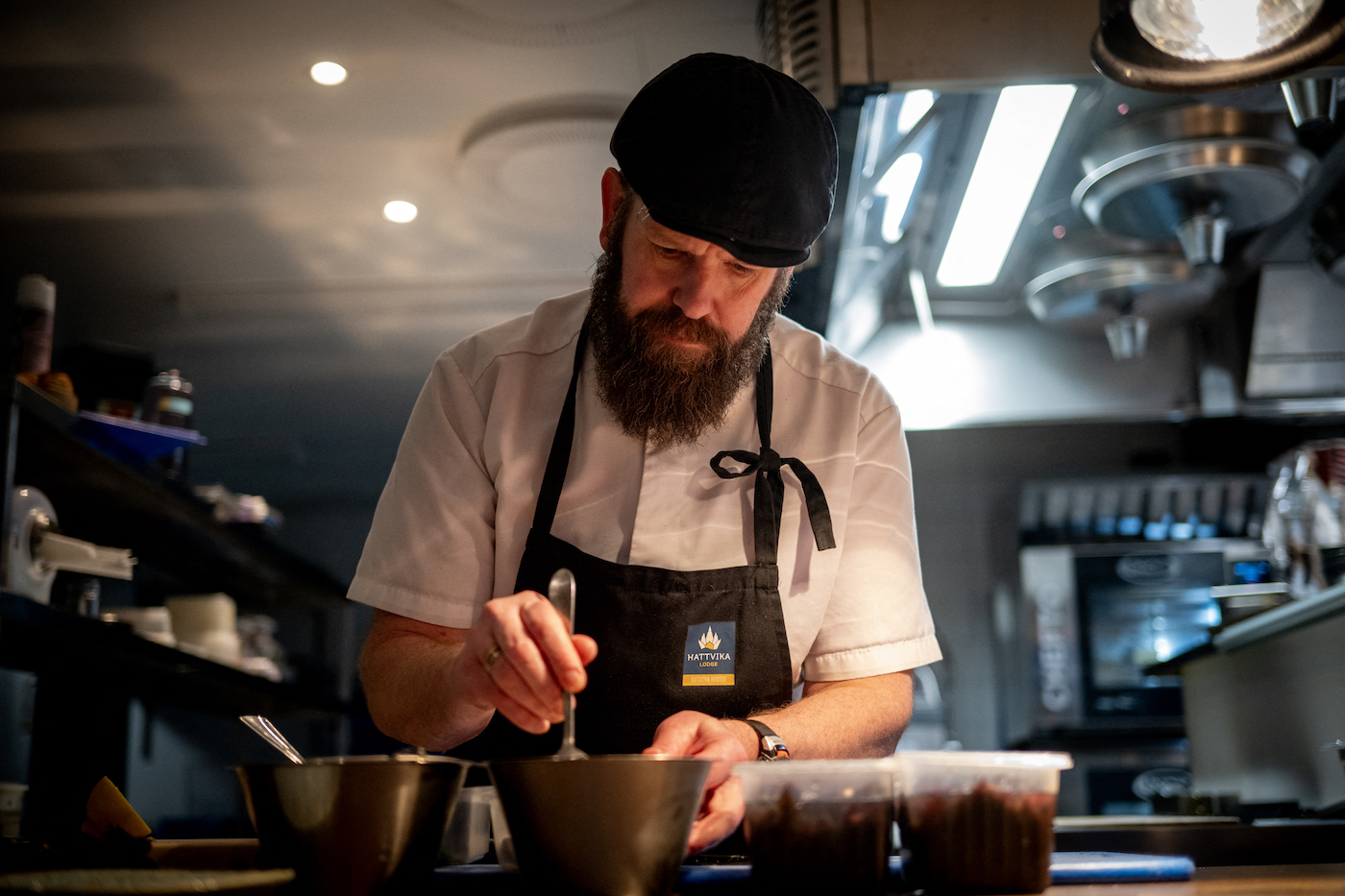 Hogei bat kilometrora, Josh Wing sukaldariak Lofoten Seaweed-eko algak prestatzen ditu duela bost-sei urtetik Hattvika Lodge luxuzko jatetxean.