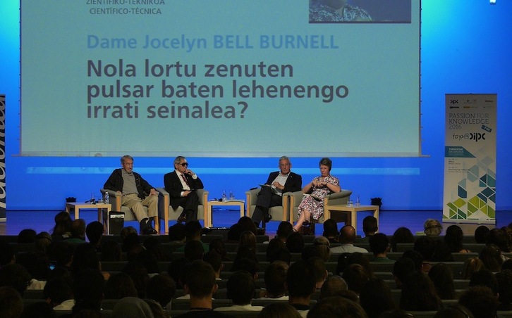 Superados algunos problemas técnicos iniciales con la traducción simultánea –Etxenike puede con todo, él mismo traduce sobre la marcha– el intercambio discurre fluido. ¿Cómo se compagina la vida familiar y la dedicación a la ciencia? ¿Cómo se sintió, señora Bell, cuando le dieron el Nobel a su jefe y la excluyeron a usted? ¿Cuál prevén que será el próximo gran descubrimiento científico?