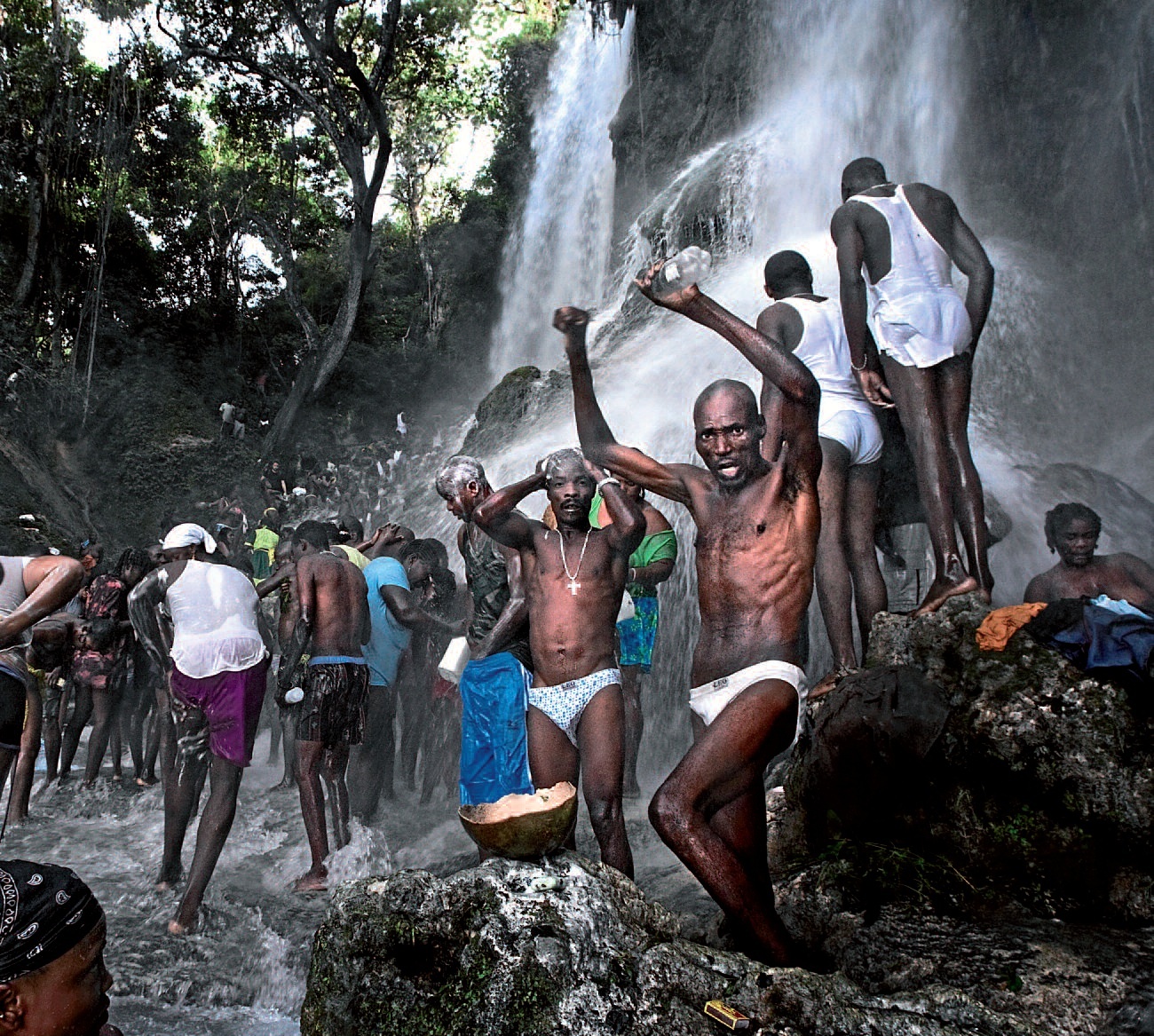 Todos los fieles, incluidos niños y embarazadas, se apiñan bajo el agua para recibir el baño de la suerte y en él se invoca la figura de Ewa Ezili, uno de los principales personajes del panteón vudú. Bajo la tromba de agua es imposible oír una palabra; los devotos bailan, hacen abluciones con sus botellas y sus cuencos de calabaza y se entregan a la comunión con sus santos, los loas. Estos tienen nombres barrocos y coloniales como Barón Samedi, Maman Brigitte, Papa Legba, Damballa y Papa Ogou.