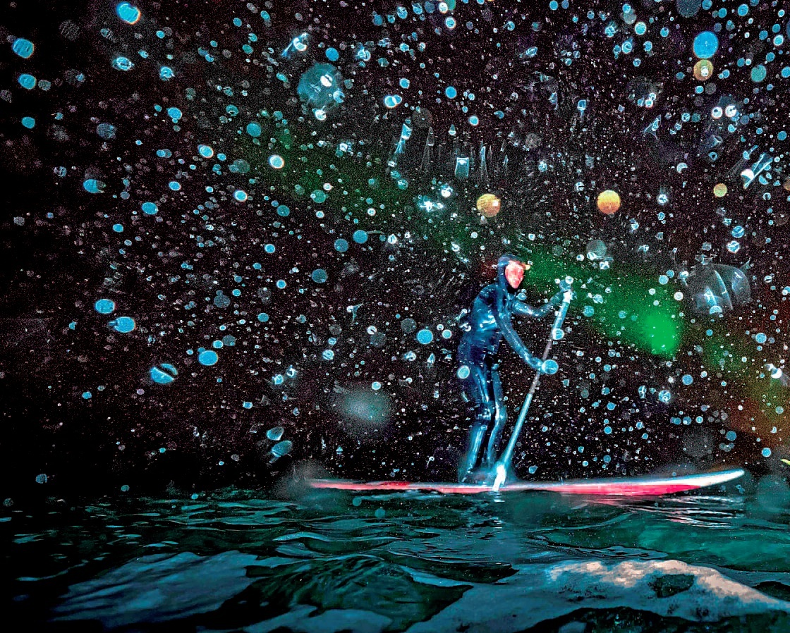 «Neguko olatuak hobeak dira, sendoagoak eta erregularragoak», azaldu du Lisa Blom-ek, hemendik ordubetera dagoen hotel baten jabeak. Udan, ostera, etengabe egun-argia dute. Edozein ordutan egin daiteke surfean. Eguneko 24 orduetan egin ditzakete, beraz, Artikoko surflari hauek jarduera desberdinak: egunez snowboard-a, arratsaldez surfa, eta gauean aurora borealez goza dezakete. Irudikoak bezalakoak, martxoko gauak berde kolorez margotu dizkigutenak.