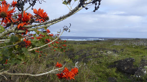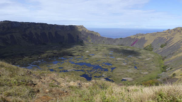 Gero, errepidea uhartearen hegoaldetik doa, itsaso zakarraren olatuen ikuspegiarekin sarri, tarteka-marteka, moai eroriren bat, ahu bat edo beste eta zelai zabalak ageri direla. Aireportua atzean utzita, Rano Kau sumendira igotzen da bizkor errepidea. Itzela da bidea, eta, ikuspegia, ez sinestekoa. Sumendira bertara lehendabizi.