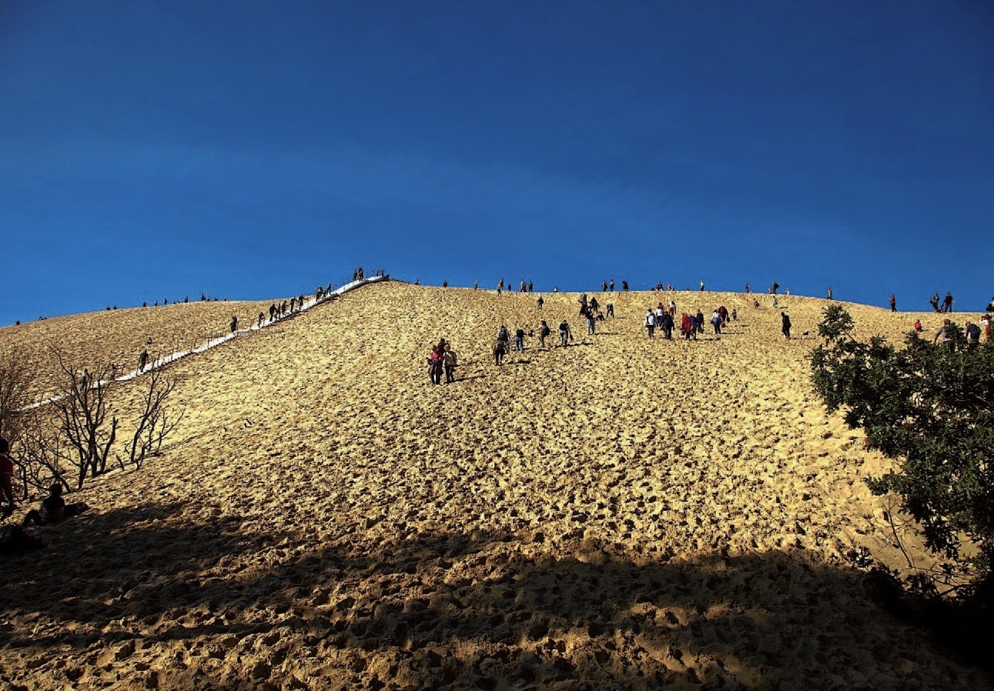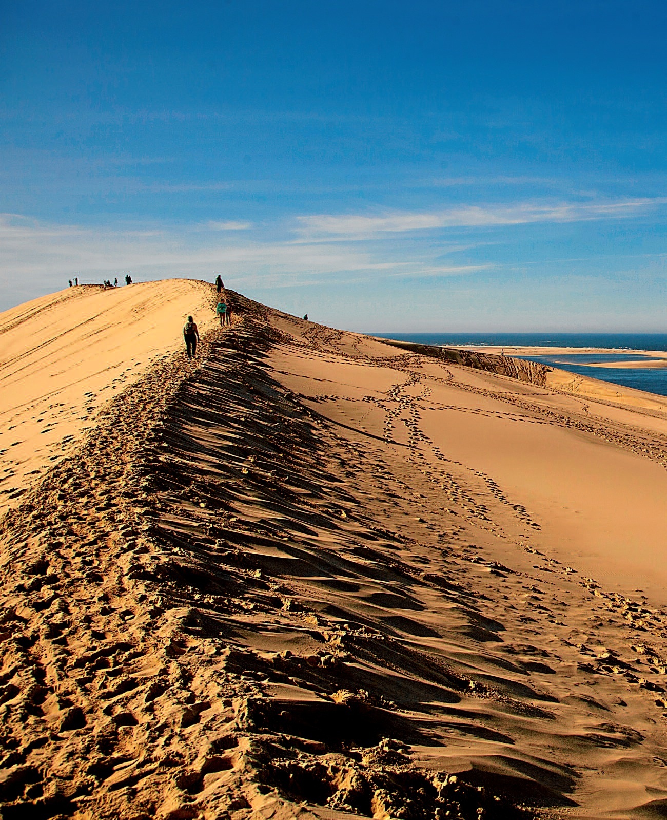 Eta biak dira egia. Dunak urtean 4 metro egiten ditu haizeberantz, ekialderantz... Haren ahotik zabaltzen diren bistak eta sentsazioak hain dira harrigarriak, ezen zaila baita horiek deskribatzea. Gure begien aurrean basoa irensten duen basamortu zati bat agertzen da, haizeak eta zerumugan zeruarekin nahasten den itsasoak bultzatuta. Olatuak lehertzen diren lekutik metro gutxira Banc d’Arguin erreserba naturala dago. Harea-banku sigi-sagatsua da, ur gaineko aurora boreal bat bezalakoa. Eta urrunean, Cap Ferret muturra, iparraldetik badia babesten duen lur besoa, itsasargi zuri-gorriarekin.