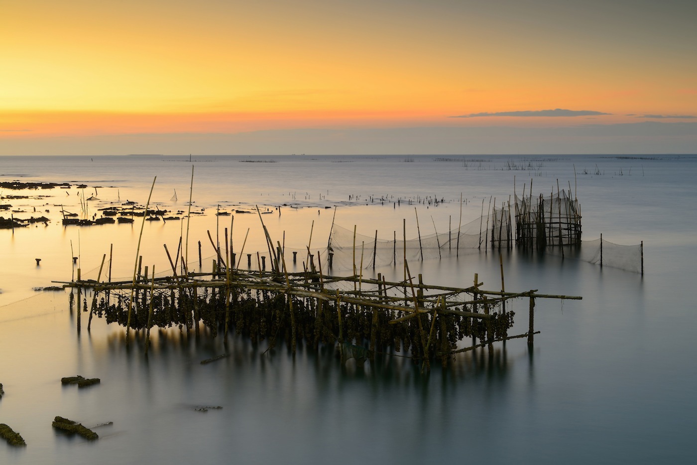 Uharte aldakor honetan daude, itsasgora eta itsasbeheren erritmoan dabilen bere lurzoru zalantzagarrian, gaurdaino kontserbatu diren bi tchanquée etxolak. Edertasun xume eta landatarrekoak dira, paisaian ezin hobeto integratzen direnak. Txabola «zangaluze» horiek palafitoak dira, mareen mendekotasunari iseka eginez ostra-hazkuntza zaintzen laguntzen zutenak. Izan ere, horixe da badiaren altxor handia, haren sukaldaritzako amu handia, 8.000 eta 10.000 mila tona artekoa. Hiru urteko hazkuntzaren ondoren, molusku honekin hornitzen dituzte Frantziako mahaiak. Ezinbestekoa da tentazioari men egin eta horiek dastatzea (crépinette delakoekin edo gabe) Gujan-Mestras, Lanton, Andernos les Bains, Ares edo L’Herbe-ko kalexka pintoreskoetan gabiltzala.