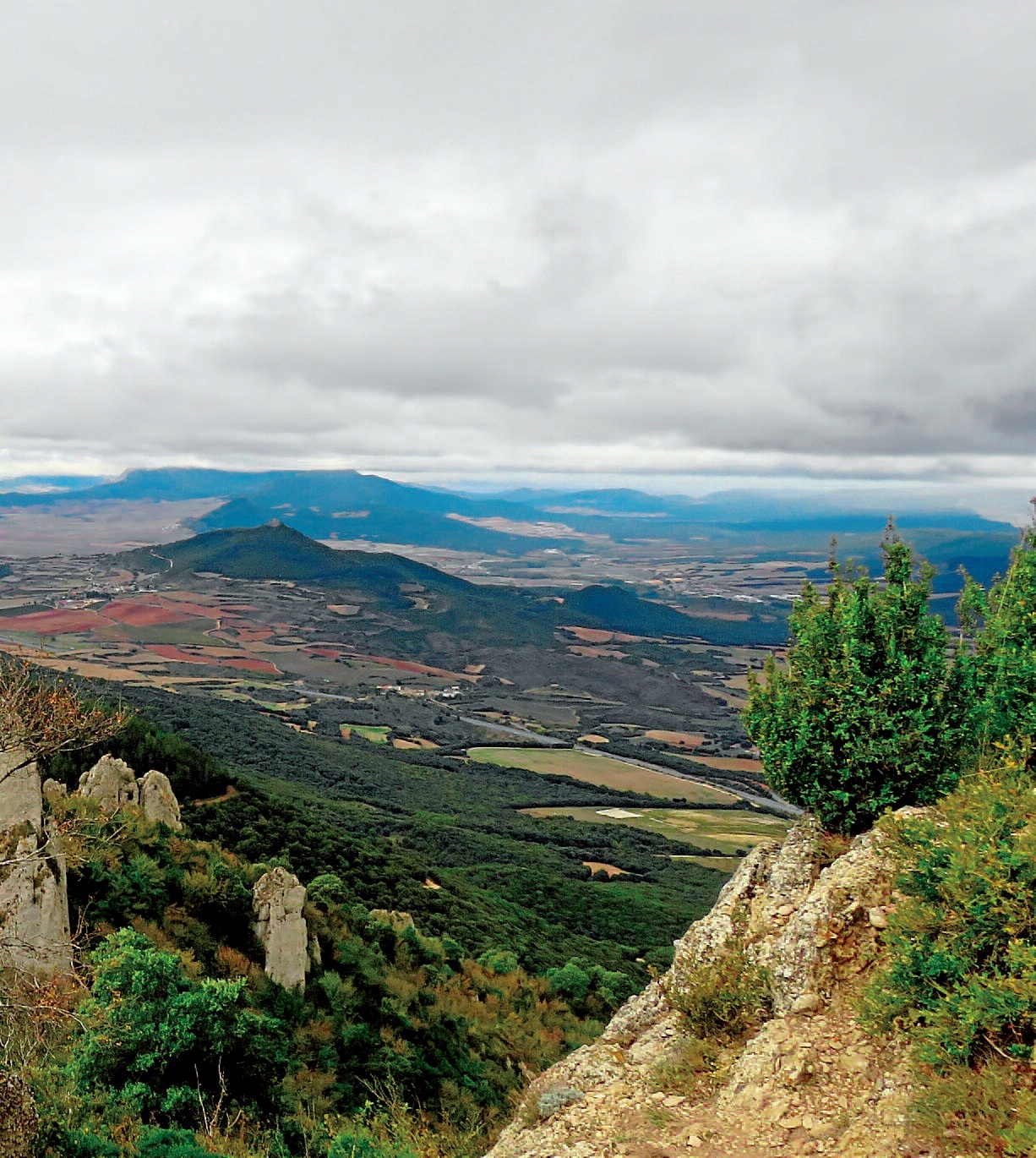 Egun argietan Mendikate Iberikoko gailur garaienak ondo ikusten dira Montejurratik, Moncayo, Urbion edota San Lorenzo izan, baina Kantauri itsasotik datozen laino hezeek paraje haiek estaltzen dituzte erabat ipar haizea nagusi denean. Mendebalderantz Monjardin gailur eta gotorleku bitxia ikusten da gertu, Viana herria eta Kodes mendiak, gure haserako destinoa, haiek ere beltz-beltz.