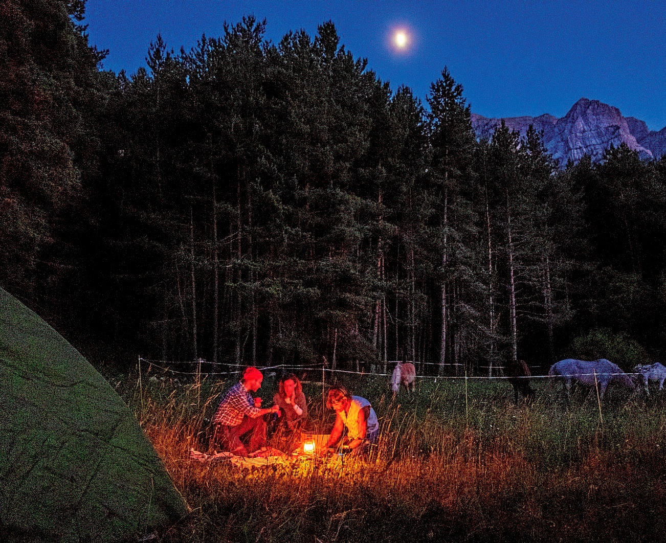 Udan gauden arren, gaua hezea eta freskoa da 1.400 metroko altueran; beraz, ondo estalita lo egingo dugu eta, euria egingo balu ere, denda ondoan dugula. Eta afaria, sari gozoa, kinke baten argitan. Cerdanyako trinxat tipikoa (patata eta aza egosia eta ondoren zartaginetik pasatua, cansalada zati batekin), bertako gazta, etxean egindako ogia eta barrena berotzen digun ardoa.
