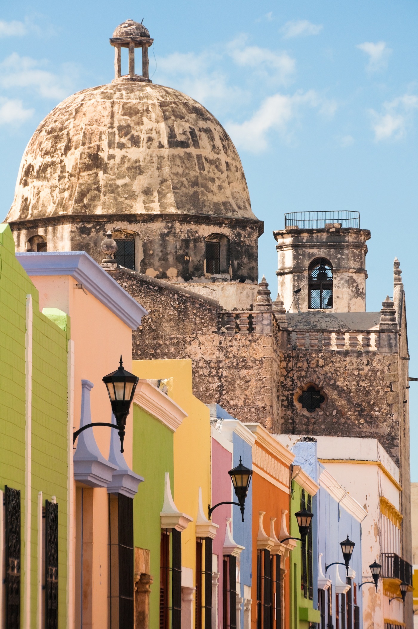 Lehen hiria izen bereko estatuko hiriburu koloretsua da. Unescoren ondare den alde zahar zoragarria dauka, harresiz eta piraten memoriez josita. Bigarrena, berriz, Yucatan estatuko hiriburua da. Kostaldean egon gabe ere hurbil sumatzen da itsasoa (egiaz, 30 kilometrora egon arren), eta erdialde atsegina dauka paseatzeko eta bisitatzeko. Bien artean, Mexikoko golkoko kostaldea dago alde batetik; Karibea izan ez arren, tropikoan gaude eta estimatzen da beti bainua hartzeko eta itsas faunaz gozatzeko txokoak aurkitzeko; bestetik, barneko bidean Yucatan osoko lautadan oihanaren erdian doazen errepide zuzenak daude: badabiltza autobus batzuk, baina alokatutako auto batek askatasun handiagoa ematen du. Behinolako zibilizazio maiaren altxorrik ederrenetakoak gordetzen dituzte baso tropikalek, Ruta Puuc izena eman zaion bidean.