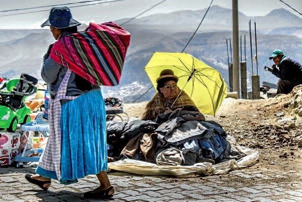 Europan saltzen dituzte dirua lortu ahal izateko, gaixoek bizi duten egoera larriari aurre egin diezaioten. Pausoz pauso, larregizko ahaleginik egin gabe, kale jendetsuak zeharkatuz hiriko kale nagusira gerturatu naiz. Horrela gomendatzen dute medikuek, soroche edo altueren gaitzak harrapatu ez gaitzan. Ia arnasarik gabe geratu naiz, ordea. Trufi delako taxi kolektibo batean sartu naiz, erdigunera ahalik eta azkarren iristeko asmoz. Baina ez dago eserleku librerik; antza, emakume batek esaten didanaren arabera, gaur merkatu eguna delako hirian. Honek esan didanez, oso ospetsua da, denetik dago salgai eta ezagutzea merezi du –beti ere tentuz ibilita eta kamera poltsikoan ondo gordeta–.