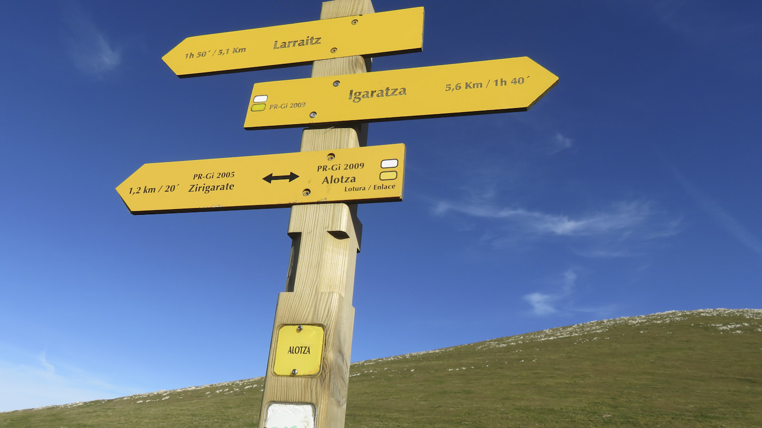 Zirigarate gainetik minutu pare batera arretaz jokatu behar da. Txindokira doan bidea utzi behar da, eta Alotza belaze zabalera daramana hartu, eskuinerantz. Igoera tentean hamar bat minutuz, eta bide eroso eta goxoa ondoren. Ardiak batzeko eskortak nonahi, uraska bete-beteak, eta harritzeko moduko paisaia aberatsa. Larreak handiak dira Alotzan, eta babesgune ezin aproposagoa da, ipar eta hego 1.300 metrotik gorako mendiek babesten duten bailara dotorea baita. Gozamena da halako gune basatian hain ibilera gozoaz gozatu ahal izatea, hezetuta eta bustita dagoen belar leunaren gainean plisti-plasta ibiltzea, malda handirik gabeko tokian.