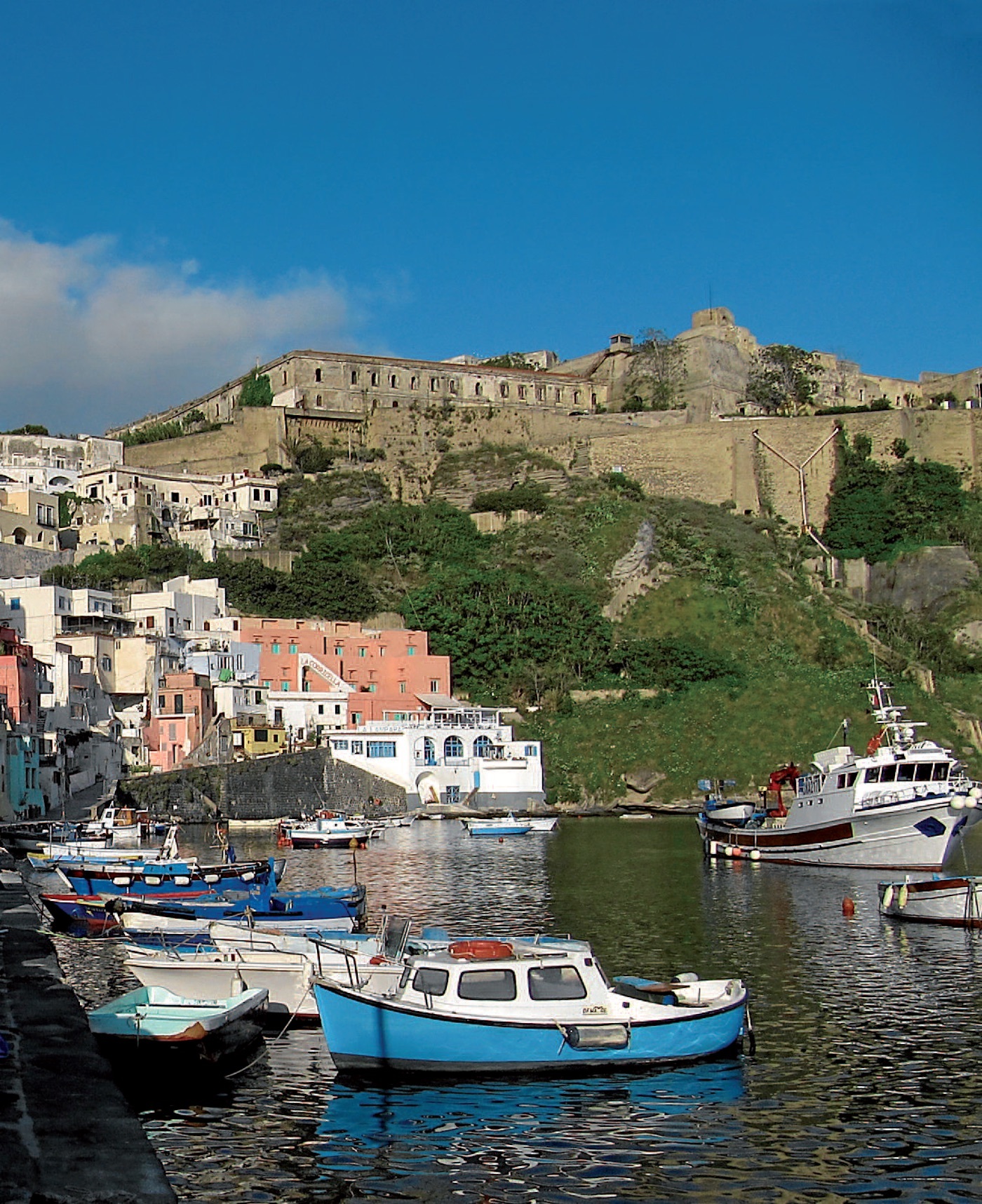 Palazzoak eta jauretxeak ere ez dira gutxi; horma luzeen atzean gordeta daude, pikondoek eta limoiz betetako adarrek inguratuta. Eta ezertxo ere falta ez dadin, espetxe bat ere badago, jada abandonatuta dagoena. Karlos V.aren aginduz eraiki zuten jauregi batean dago, Procidako labar altuenaren gainean. Auskalo iraganean zein irizpideren arabera banatuko zituzten ziegak, baina preso batzuek harrizko patio arrunt bat ikustearekin konformatu beharko zuten, eta beste batzuek, aldiz, itsaso berde urdinxkararen ikuspegia izango zuten, hondoan Napolesko badia eta eskuinaldean Vesuvioren irudia zutela.