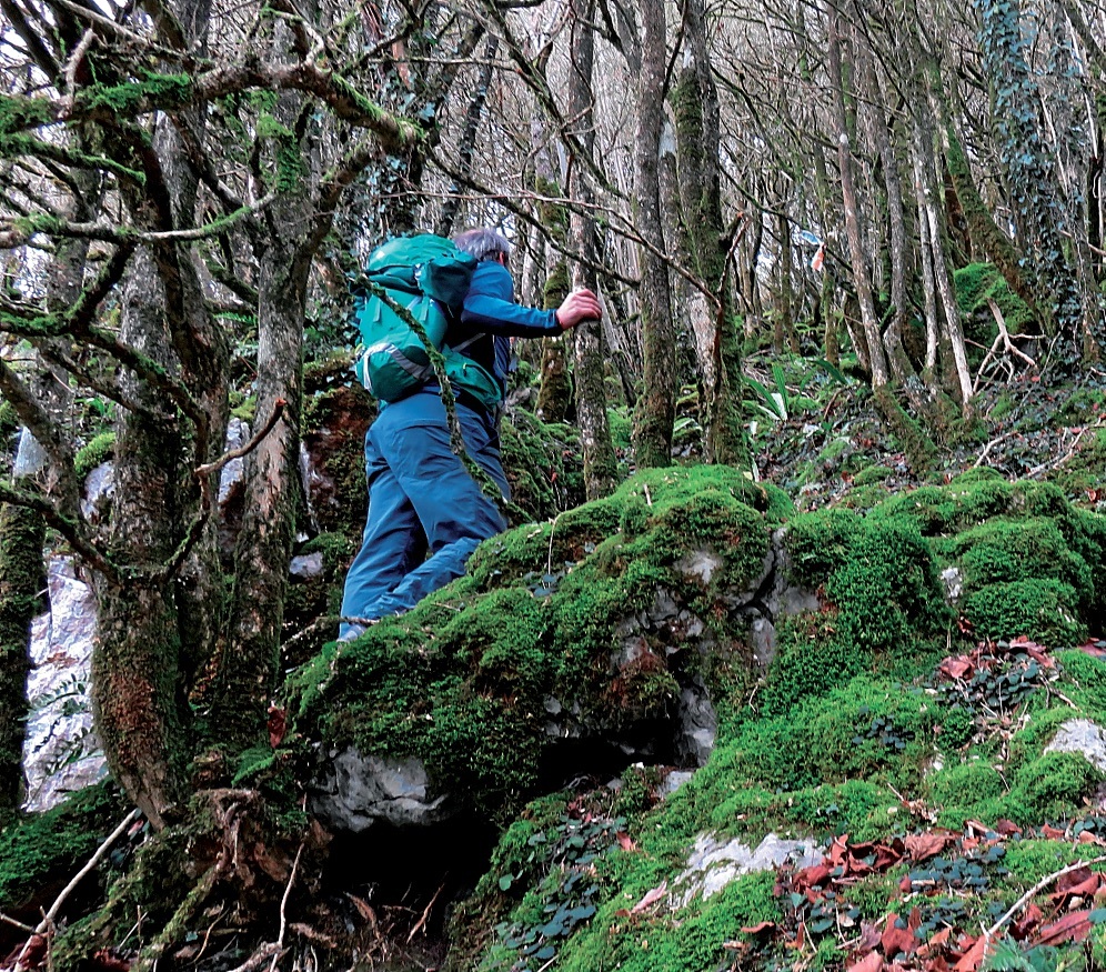 Bidezidorrak irtengunea bilatzen du horma eta belazearen artean, pasabide erraz bat. Mendizalea berehala jabetuko da belar eta hosto zorua atzean utzi eta harri eta ezpel-pago anabasan sartu dela. Bertan progresioa nekosoa da. Geldialdi asko egin behar direlako bide zuzena ez galtzeko. Pintura gorriak bukatuta, zuhaitzetatik zintzilikatuta dauden zintak jarraitu behar dira. Kuriosoa da, baina zintak ez dira Ipar Euskal Herrikoak, “Udaltzaingoa” leloa baitaramate. Zinta bat edo beste izan, eskerrak mendizaleren batek bidea seinaleztatzeko ardura eta pazientzia hartu duen. Zintak, dena den, motzak dira, eta tarteka urriak. Adi-adi egin behar da bidea gorantz, erreferentziarik ez galtzeko.