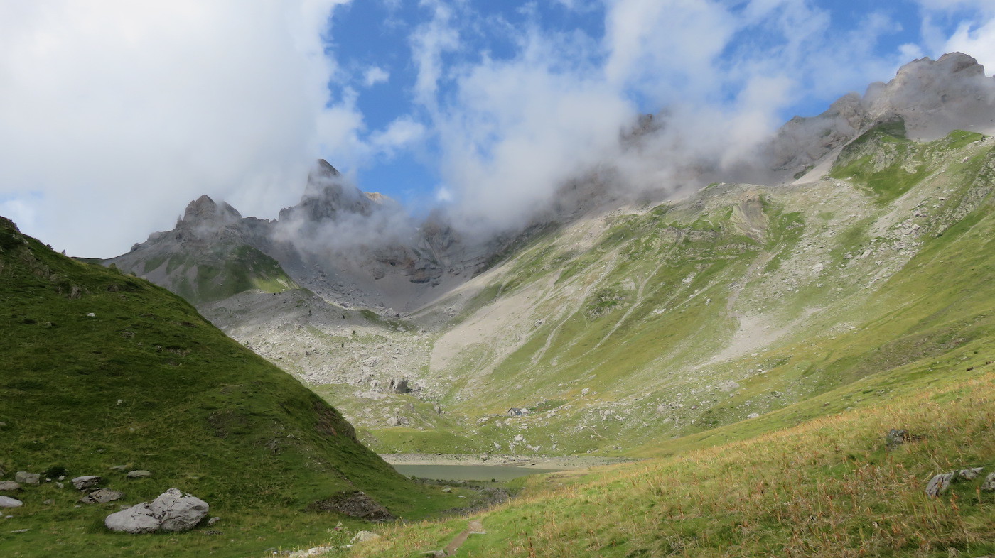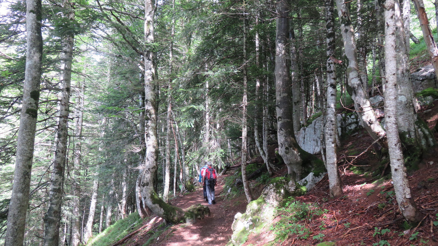 Lainoak jolasean dabiltza mendi garaiak nola gainditu aztertzen. Lehen ordu erdia pista batean barrena egiten da. Bertako artzainek eta egur ustiatzaileek erabiltzen dute. Izan ere, Larrangus baso aberatsa pago sendo eta erraldoiez osatuta dago. Pendiza handia da tarteka, justu Billere mendiaren azpiko pasabide bitxi batera heldu arte, 1.400 metrora. Han zuhaitzak bakantzen hasten dira, eta harri bidea nagusitzen hasi. Lhurs aintzira gertu dago, eta handik jaisten den urak harri puska handiz betetako arroa zeharkatu behar du bidea egiteko.