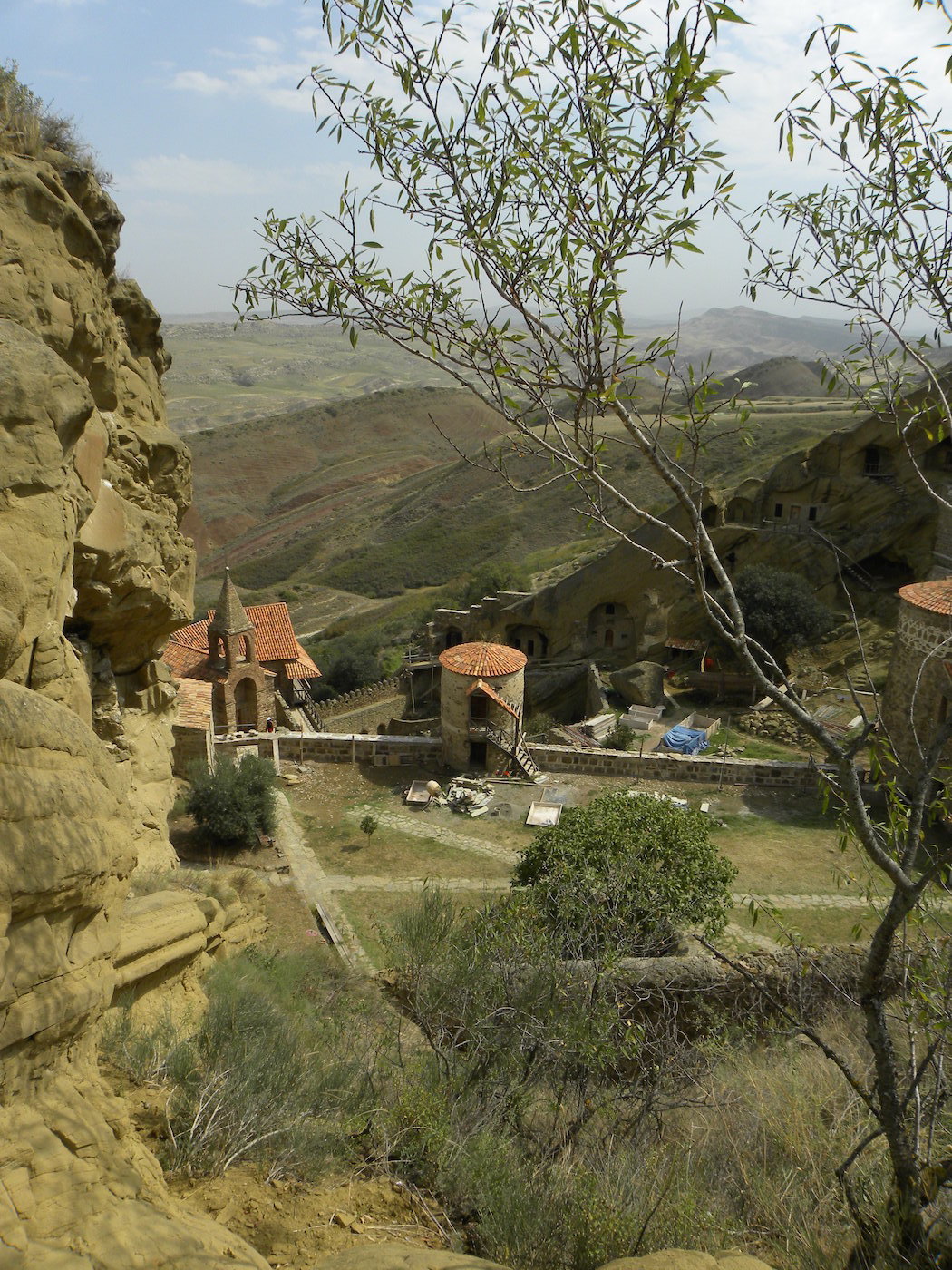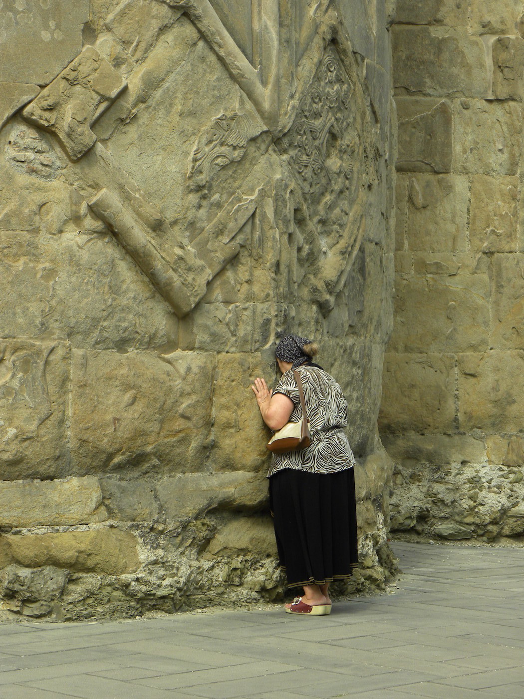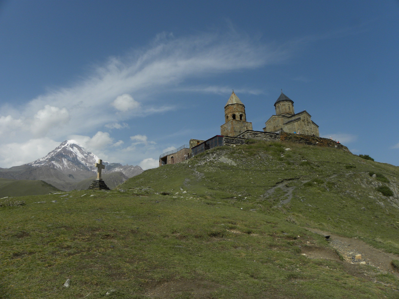 La imagen de la capilla conocida aquí como Tsminda Sameba (de la santa Trinidad) es icónica en Georgia. Capilla y campanario se alzan desde el siglo XIV sobre una colina a más de 2.200 metros. A sus espaldas el monte Kazbek yergue su inmensa mole. En un radio de 360º las vistas impresionan por la majestuosidad de la dentada cordillera que rodea el horizonte de la capilla. Una sensación de trascendencia se apodera de buena parte de los que hasta aquí suben. Los más cómodos, en todoterreno, recorriendo los seis kilómetros del ancho camino de tierra que parte desde Kazbegi. Otros prefieren seguir el camino tradicional de peregrinación, una senda abrupta y empinada en la que no es infrecuente ver peregrinos descalzos y mujeres que ocultan sus cabellos con un velo.