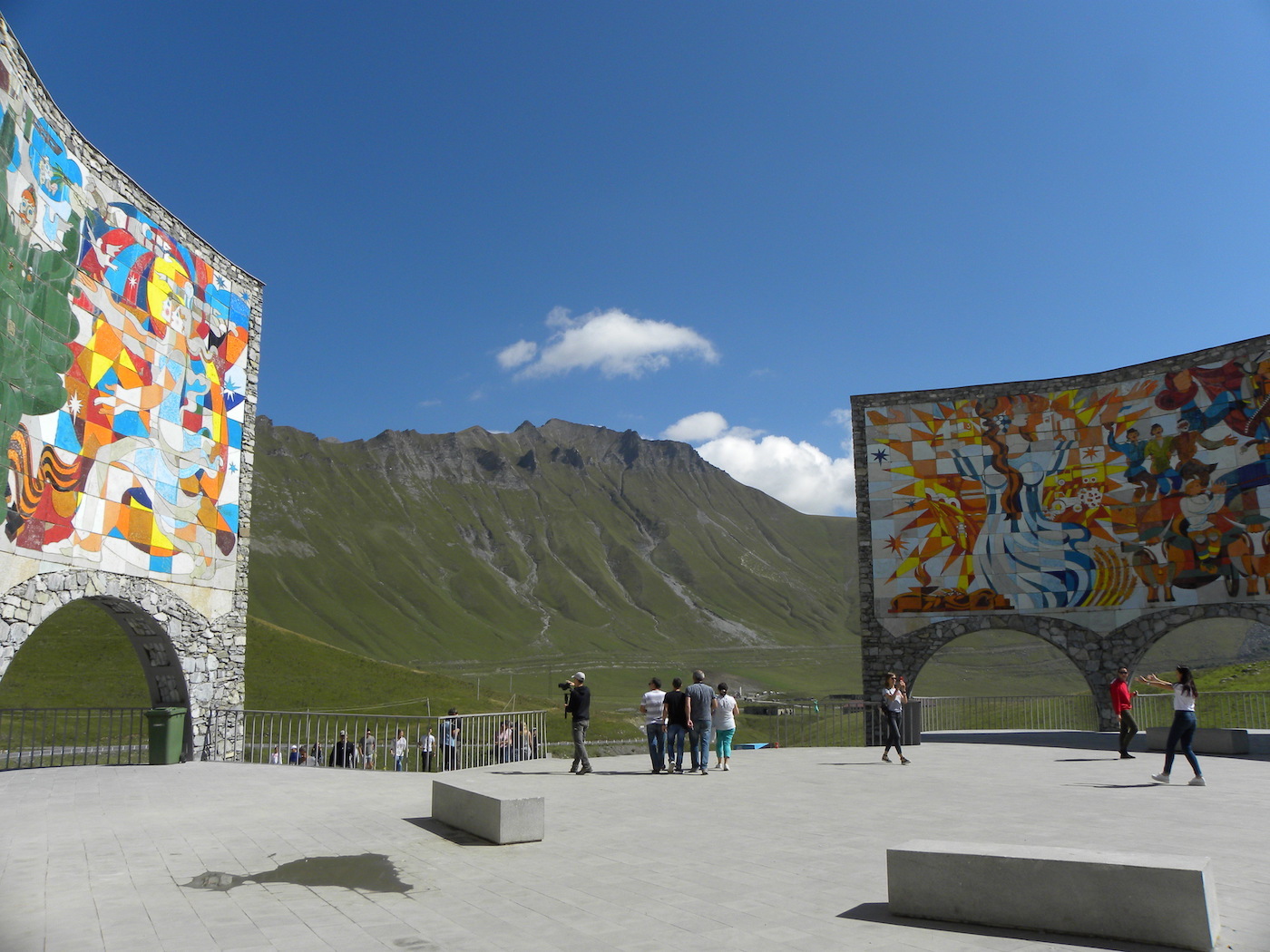 En un remedo mecánico de las antiguas caravanas largas filas de camiones suben asmáticos las pronunciadas pendientes. Muchos exhiben en sus matrículas la tricolor rusa, aunque buena parte de ellos son armenios. Y es que la patria del albaricoque, con sus fronteras con Turquía y Azerbaiyán cerradas, apenas tiene posibilidades terrestres de suministro ajenas a esta ruta. Cerca de Kazbegi se anuncia ya la proximidad con Osetia del Norte (Rusia) en forma de kilométricas colas de camiones aparcados en el arcén y esperando su turno para cumplimentar los farragosos trámites fronterizos.