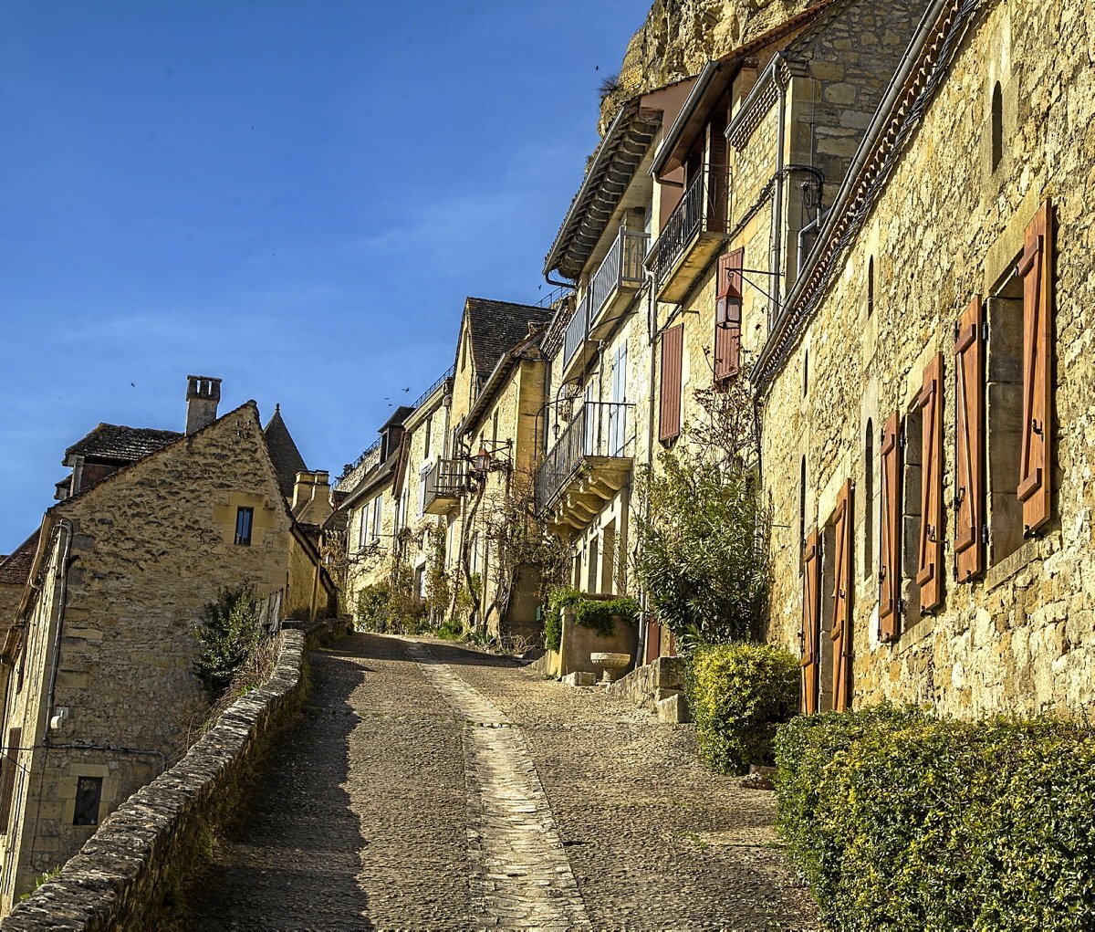 Eta, jakina, herriak, hondarrezko erlojurik ere asmatu ez balitz bezala kontserbatuta daudenak. Baserria edo gaztelua? Ez dakigu zer den Castelnaud-la-Chapelle, ezta axola ere, harriaren, arrokaren eta arrano habiaren sinbiosi perfektua da, trobadorearen bertsoa du eta botere feudalaren ezpata. Talaia horren harresietatik ikus dezakegu zeruan ebakia Beynac-et-Cazenac-en irudi lerdena.