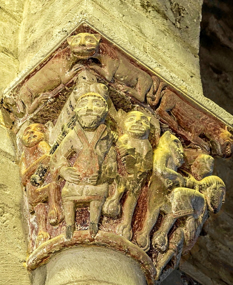 Habearte koskorraren barruan -asteburuetan irekita egon ohi da-, jada ez dira gure zain hormetan Ebanjelioan doktrinatzen zuten Erdi Aroko pintura koloretsuak, Nafarroako Museora eraman baitzituzten gorde eta erakusteko. Agertuko zaizkigu, ordea, landare-dekorazio, eguzki-disko, giza buru eta infernuko eszena beldurgarrietako kapitel gehiago, oraindik ere kolore hondarrekin. Haien sinbolismoagatik, nabarmentzekoak dira lepotik zintzilik poltsa handiz zamatutako pertsonaia zikoitz batzuk, demonio batzuek egurtuta. Tenpluaren akustika ezin hobean, haien izu-oihuen oihartzuna entzun dezakegu oraindik. Paradoxikoa oso, Elizak bere onurarako bereganatu izana seigarren bekatu kapitalaren halako kondena erakusten duen eraikina.